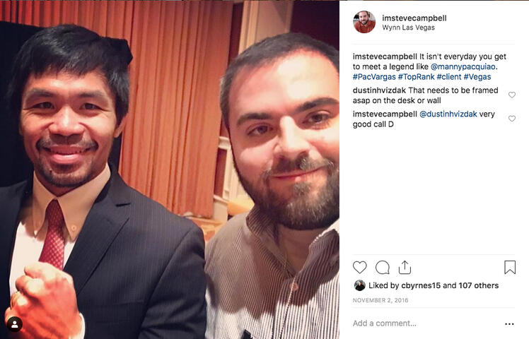 The week before the event, I was on the ground of the Wynn hotel in Las Vegas, capturing and creating social content from behind the scenes (especially for Snapchat). Our team had access to the red carpet when the fighters first arrived at the hotel, as well as all press conferences, interviews, and closed training events, as well as the much-hyped weigh-in.On fight night, our VaynerMedia team sat ringside at the event, tweeting copy and sharing key visual moments from all twelve rounds of the #PacVargas fight, as well as the undercard bouts that preceded. In the end, Manny Pacquiao reigned supreme.